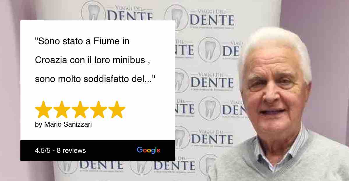 Sono stato a Fiume in Croazia con il loro minibus, sono molto soddisfatto del viaggio e dei trattamenti ricevuti in studio. Dottori preparati, cortesi e prezzi molto molto convenienti. Hofatto un’implantologia completa, sopra e sotto con 12 impianti e protesi fisse. Rispetto al migliore preventivo italiano alla fine ho risparmiato circa 8000 euro. Grazie a tutto lo staff di Viaggideldente.it Mario Sanizzari